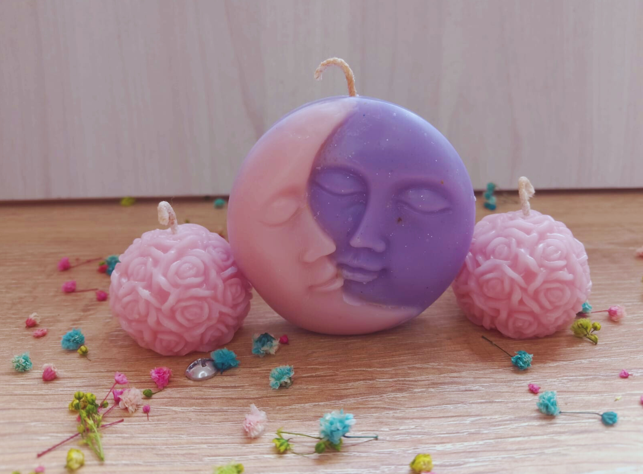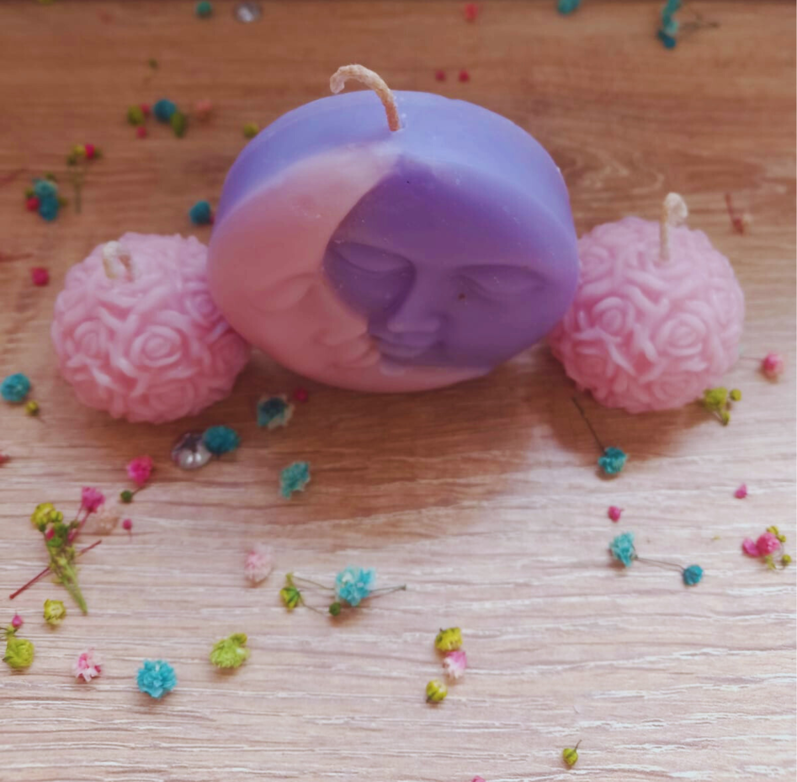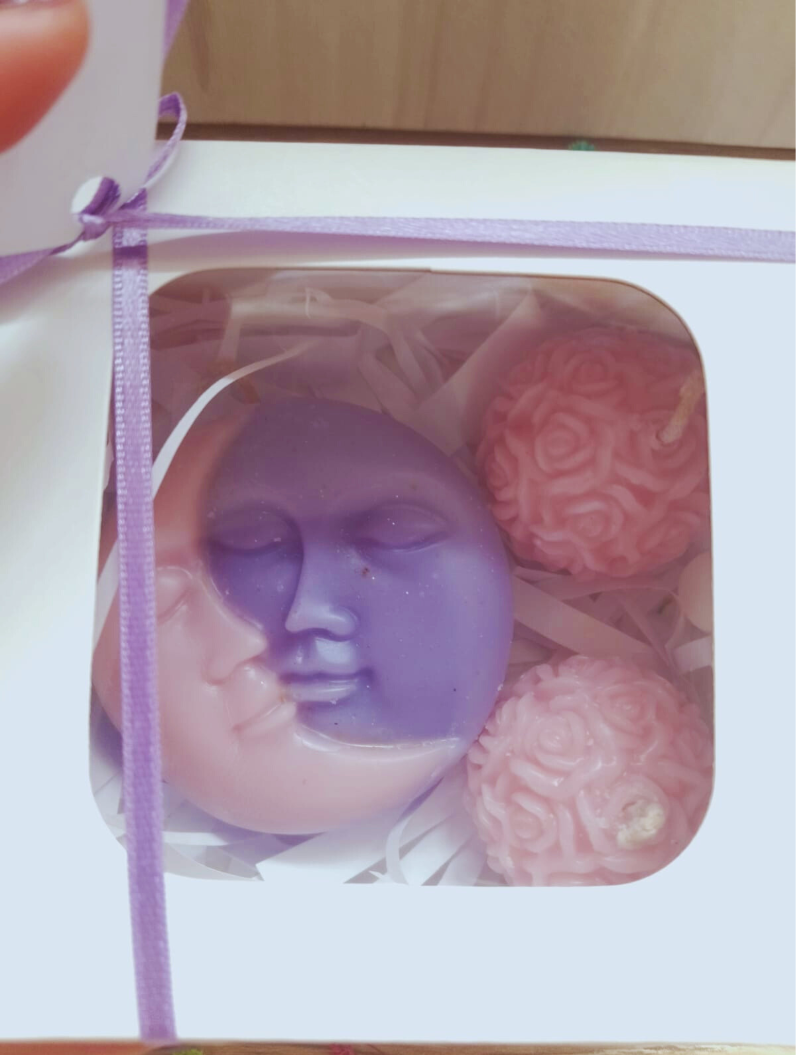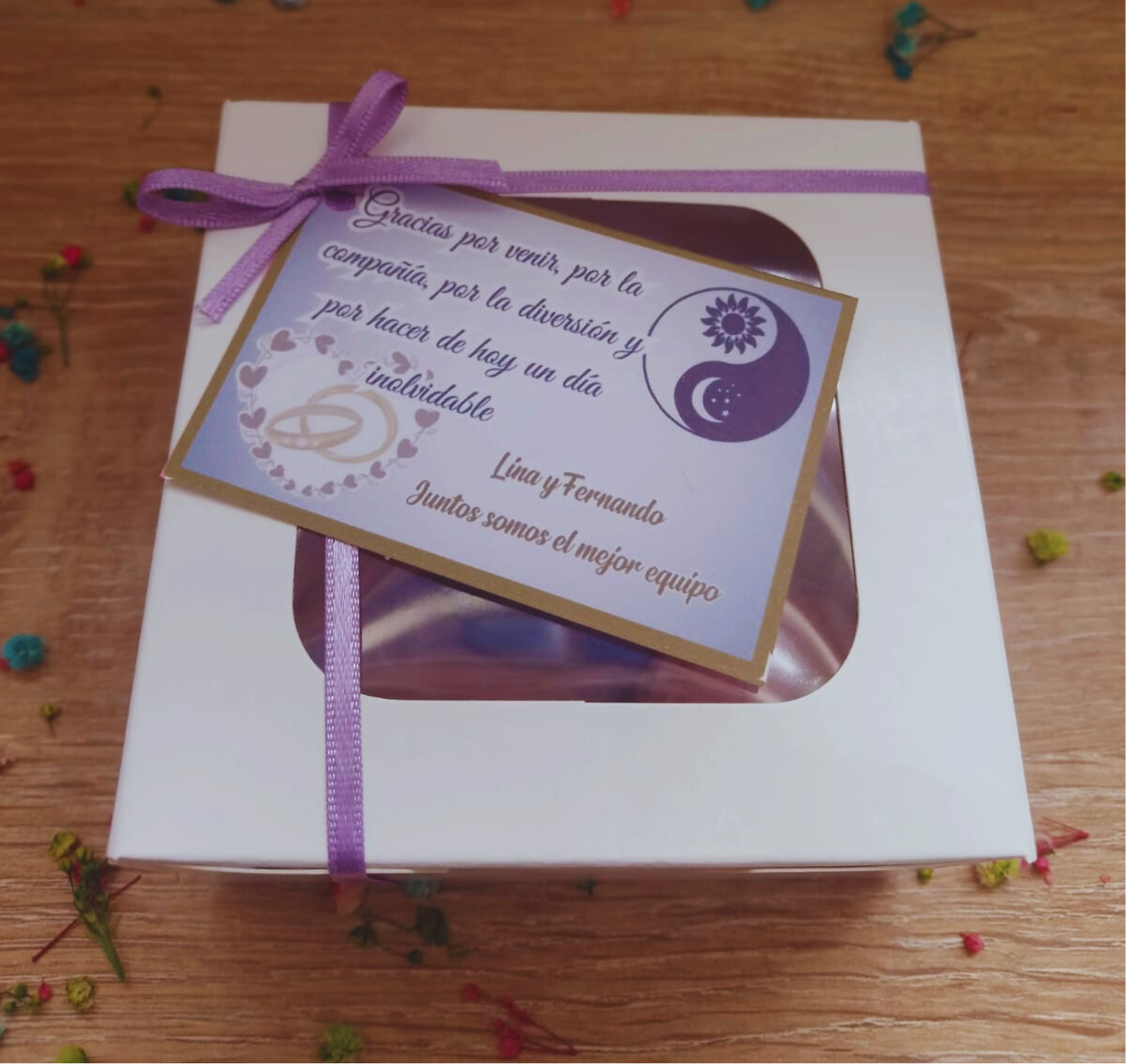 Sol y Luna, con dos esferas rosas en caja aromatizadas y personalizadas con papel decorativo. Tu eliges: colores, aroma, mensaje e imagen de la tarjeta.